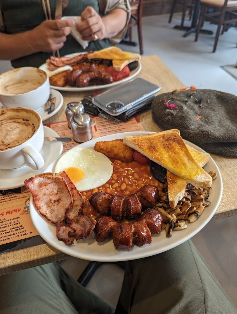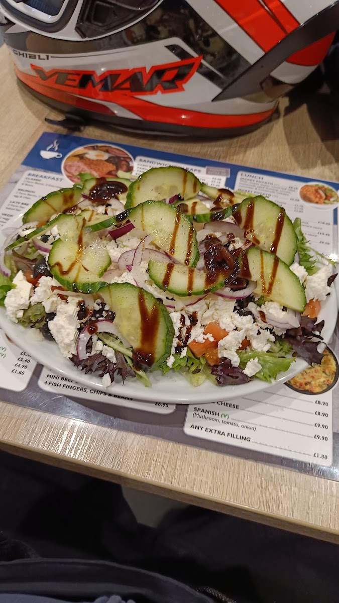 Stopped off for breakfast whilst out on my motorbike with 3 colleagues, the cafe was packed, bit a kind lady who was sitting on a table for 4, kindly moved to a smaller one. Breakfast was ordered at the counter, and the waitress assisted with our choice, which was of a good selection. Breakfast was brought to our table with all the necessary cutlery and condiments. It was a well proportioned meal and cooked to perfection, which made it very tasty, overall a great experience albeit a little expensive but in today's market this is probably what you need to pay for this service and quality.